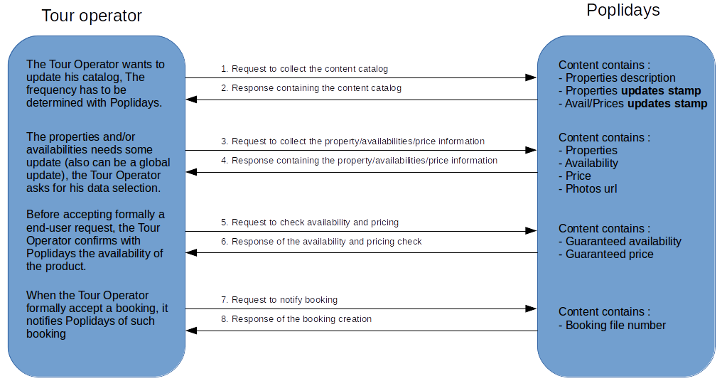 Poplidays provides preproduction environment for testing these API(s), allowing you: catalog retrieval, information updates, real time check and booking notification full functional testing.